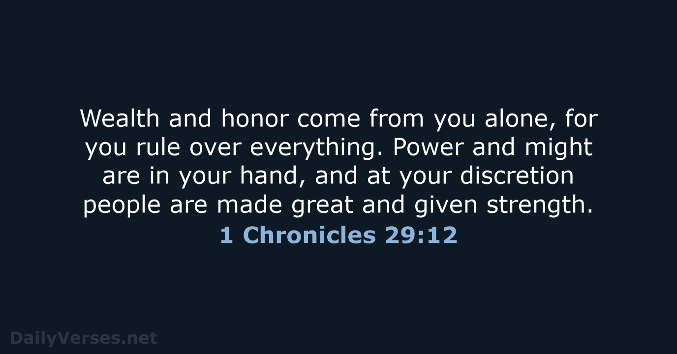 1 Chronicles 29:12 says, "Wealth and honor come from you; you are the ruler of all things. In your hands are strength and power to exalt and give strength to all." In this verse, King David acknowledges that God is the source of all prosperity, honor, and strength. This declaration comes from David’s prayer as he prepares to hand over the throne to his son Solomon and commission the building of the temple. David’s words remind us that every blessing, including wealth, power, and honor, comes from God’s sovereign hand. This verse is a powerful reminder of God’s authority and generosity.