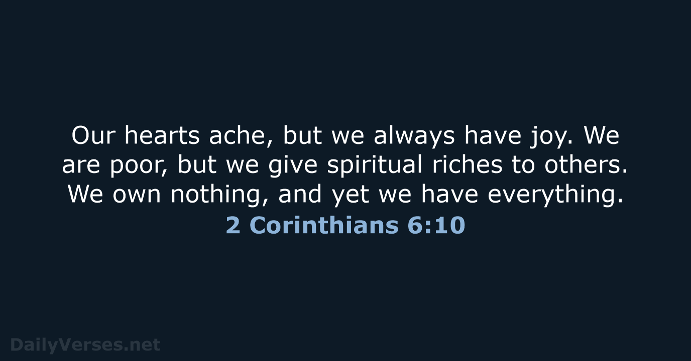 Our hearts ache, but we always have joy. We are poor, but we give spiritual riches to others. We own nothing, and yet we have everything. - 2 Corinthians 6:10 NLT