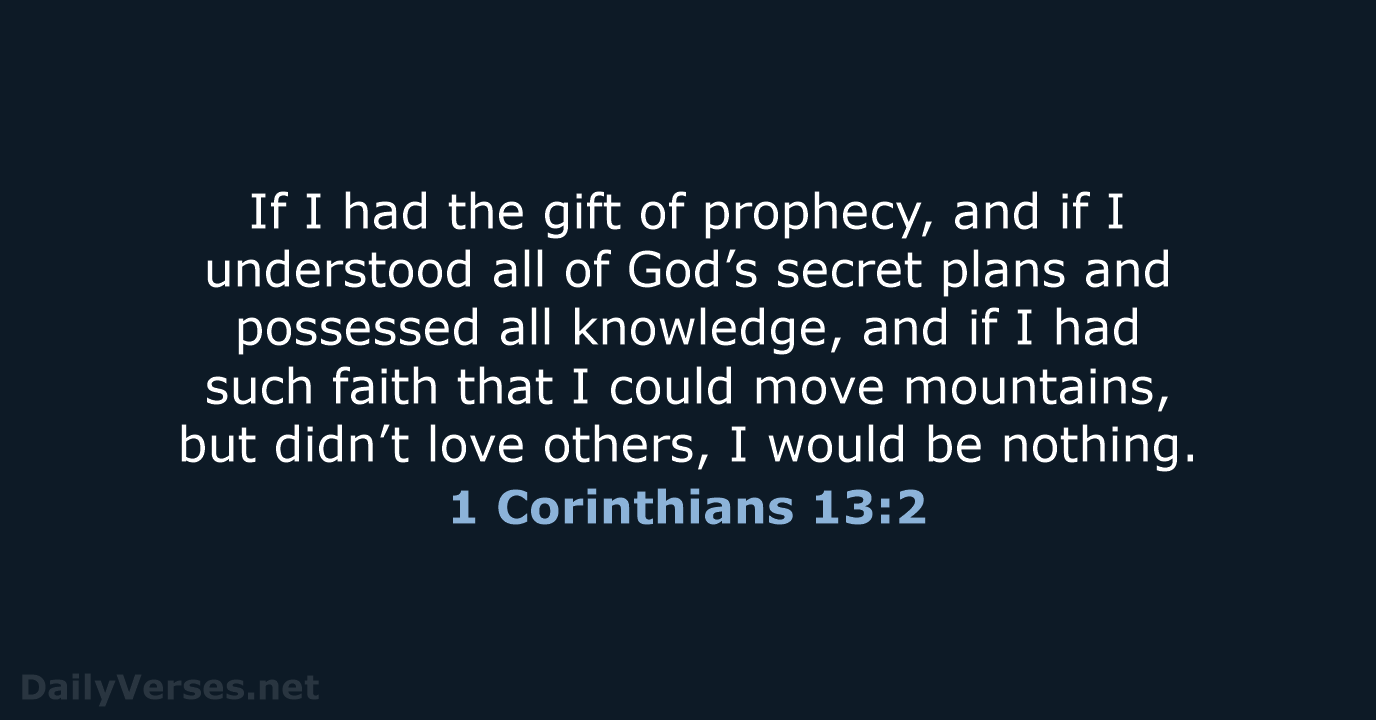 If I had the gift of prophecy, and if I understood all of God’s secret plans and possessed all knowledge, and if I had such faith that I could move mountains, but didn’t love others, I would be nothing. - 1 Corinthians 13:2 NLT