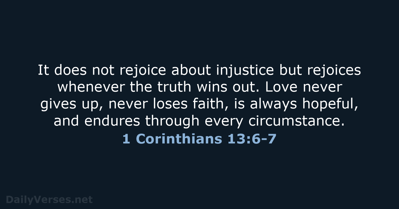 It does not rejoice about injustice but rejoices whenever the truth wins out. Love never gives up, never loses faith, is always hopeful, and endures through every circumstance. - 1 Corinthians 13:6-7 NLT