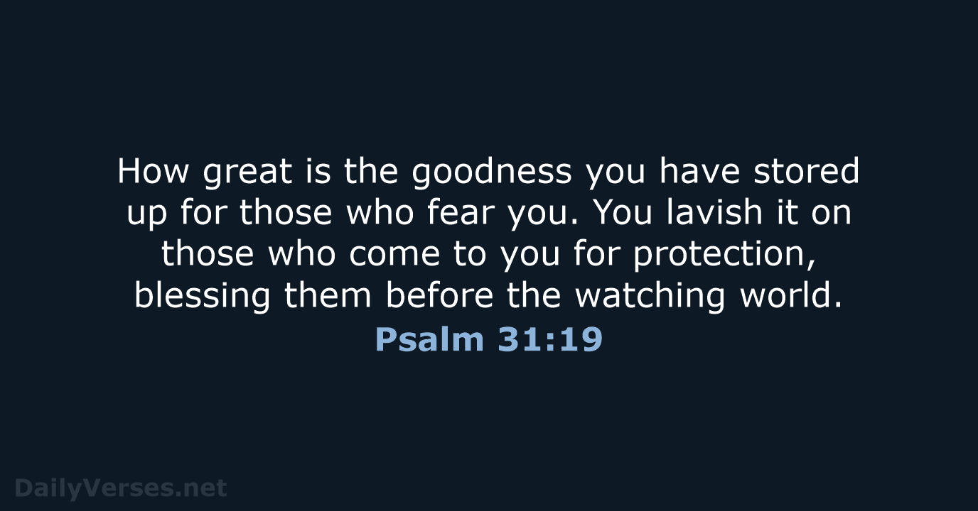 Psalm 31:19 says, "How abundant are the good things that you have stored up for those who fear you, that you bestow in the sight of all, on those who take refuge in you." In this verse, David praises God for His abundant goodness, expressing deep gratitude for the many blessings God has prepared for those who fear Him and seek refuge in His protection. It is a proclamation of God’s faithfulness and a reminder that His goodness is both vast and visible for those who trust in Him.