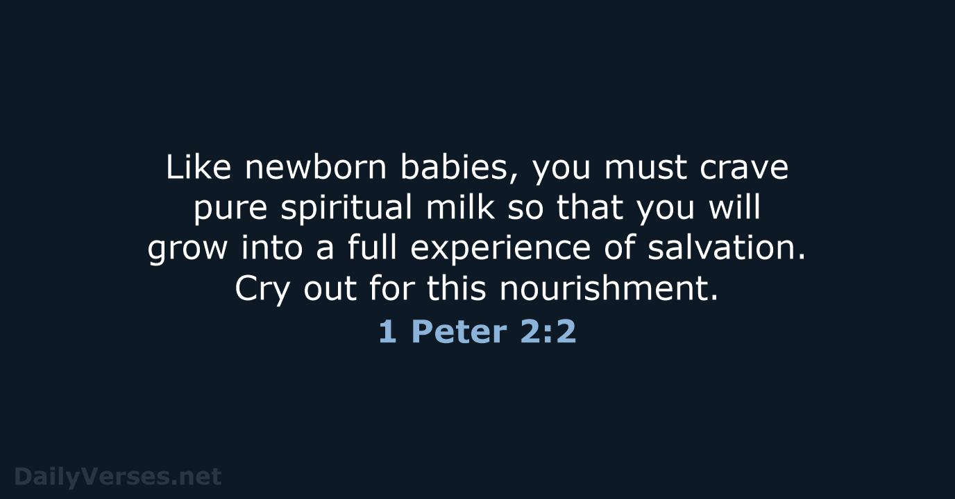 1 Peter 2:2 says, "Like newborn babies, crave pure spiritual milk, so that by it you may grow up in your salvation." This verse draws a powerful analogy between newborns craving milk and believers craving the nourishment of God's Word. Peter encourages believers to desire the spiritual nourishment necessary for growth, maturity, and deepening their faith. Just as babies need milk for physical development, Christians need the sustenance that comes from God’s truth to grow in their spiritual journey and fully embrace their salvation.